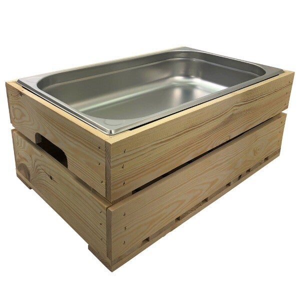 Geef je buffet een extra boost met deze houten kratjes waar de binnenbakken van een chafing-dish perfect in passen.